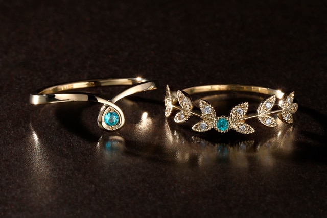 人気の Bouquetシリーズ より「Olive」と「Ribbon」に、希少なパライバトルマリンをセッティング。