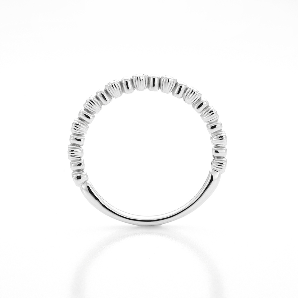 アンティークの技法であるミル打ちを施し、クラシカルな雰囲気を演出しています。女性用はあしらった7石のダイヤモンドをひとつひとつを囲む繊細な細工が見事です。男性用はミル打ちのみで仕上げました。細身のストレートラインは重ねづけで違う雰囲気に。
