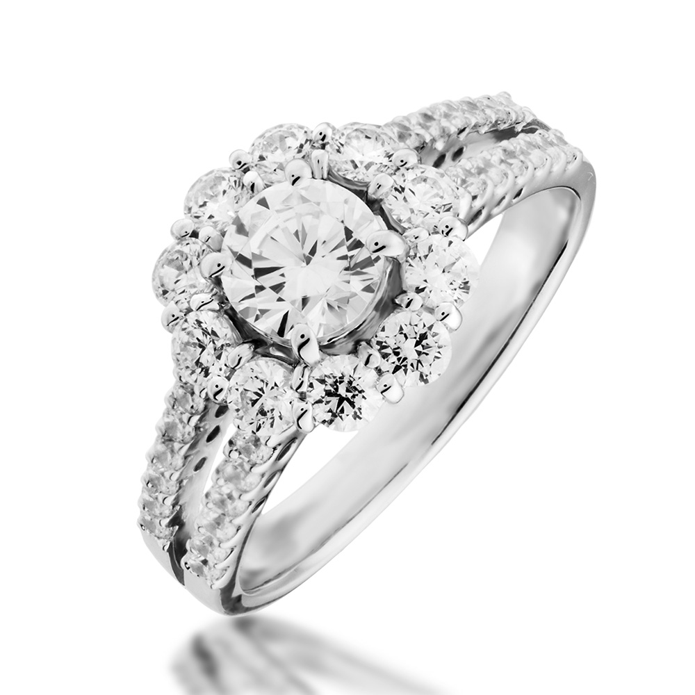中石を大きめのメレダイヤで取り囲み、アームのダイヤも豪華なヘイロースタイル