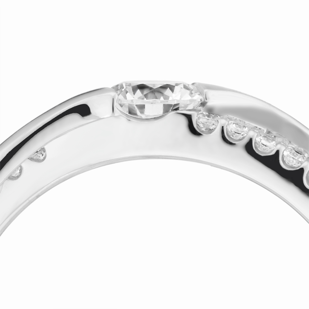 埋め込みタイプのセンターストーンと3連リングのように見えるデザインの組み合わせでモダンなイメージに仕上げたエンゲージリング。2本のアームにメレダイヤを添えて。